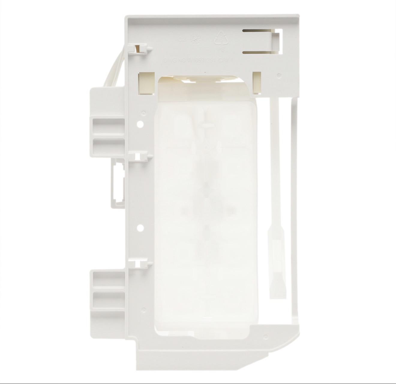 Whirlpool Genuine OEM W10873791 Refrigerator Ice Maker Assembly. This ice maker includes the ice mold and the control device. The ice maker receives water from the water inlet valve and then holds the water in the ice mold until the water freezes solid. It then automatically ejects the ice and refills to continue the process until the ice storage bucket is full.